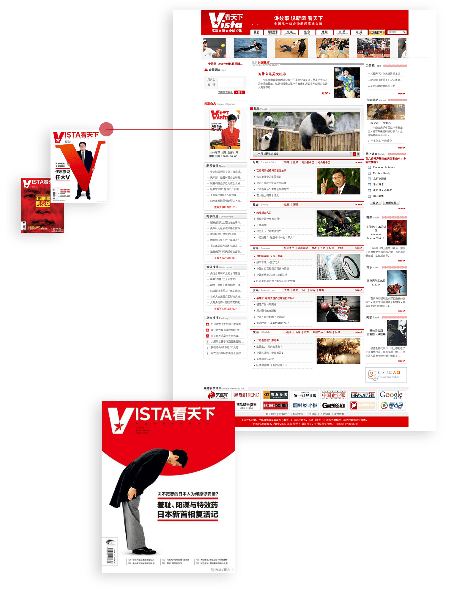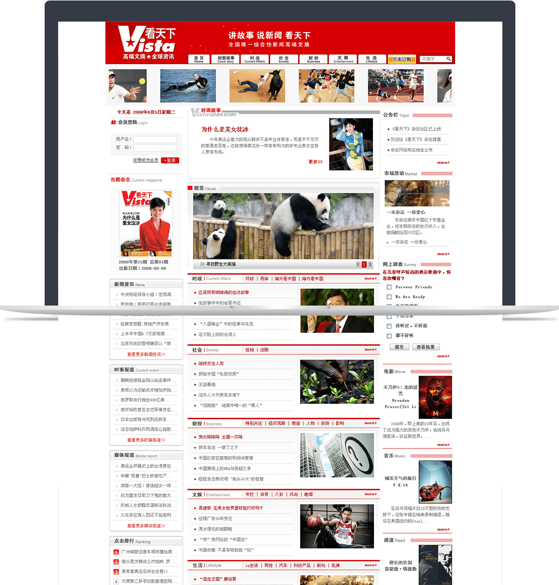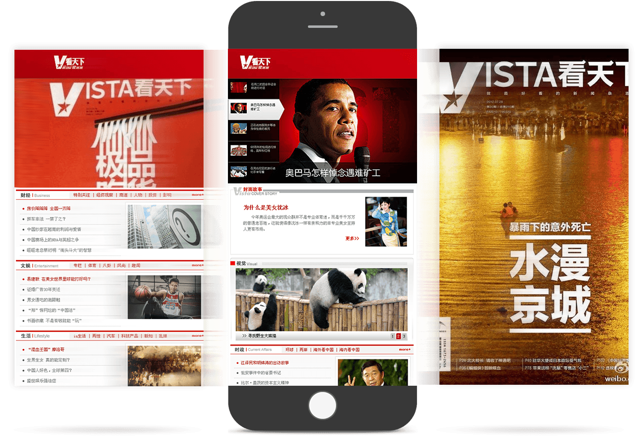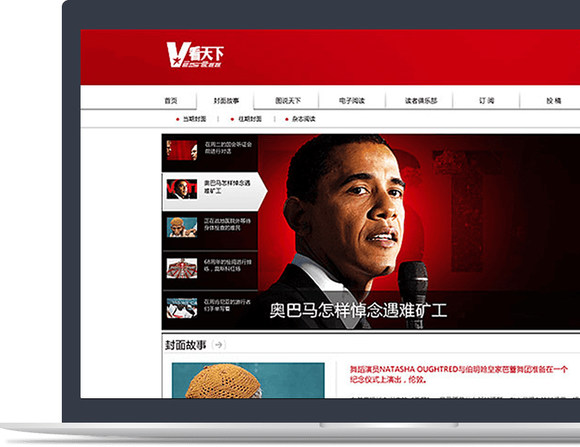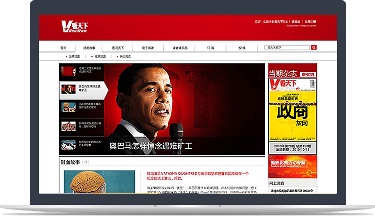 網(wǎng)站與雜志相輔相成,設計風(fēng)格上有異曲同工之妙。同時(shí)通過(guò)訂閱功能和微博同步窗口,幫助《看天下》更便利的“說(shuō)新聞,講故事”,進(jìn)一步擴大在主流