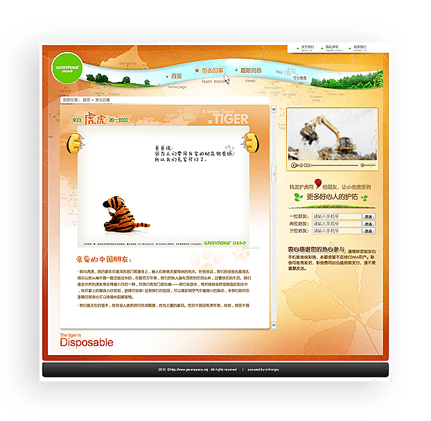 綠色和平網(wǎng)站舉辦《別讓清風(fēng)卷走老虎》等多個(gè)線(xiàn)上公益活動(dòng),吸引用戶(hù)參與。新鴻儒長(cháng)期負責其網(wǎng)站的維護和運營(yíng)推廣工作,保障網(wǎng)站穩定、有效運行。