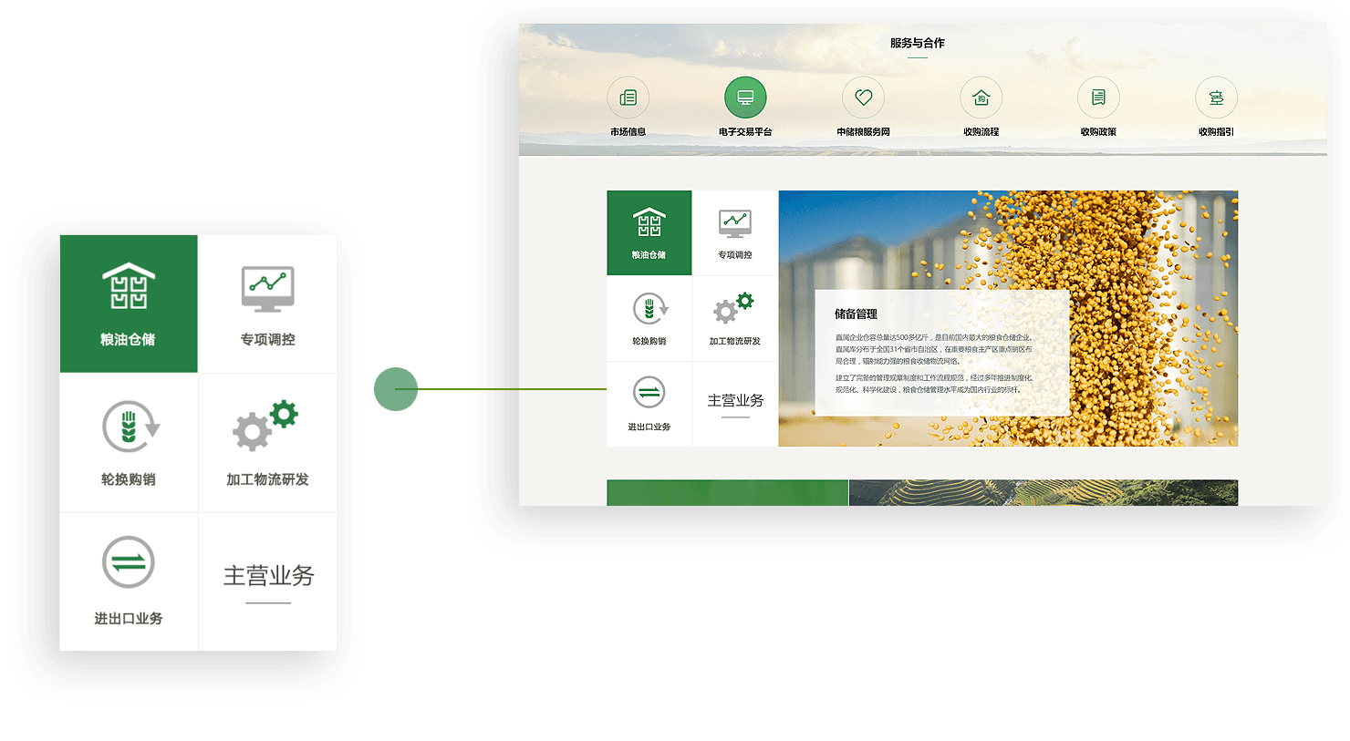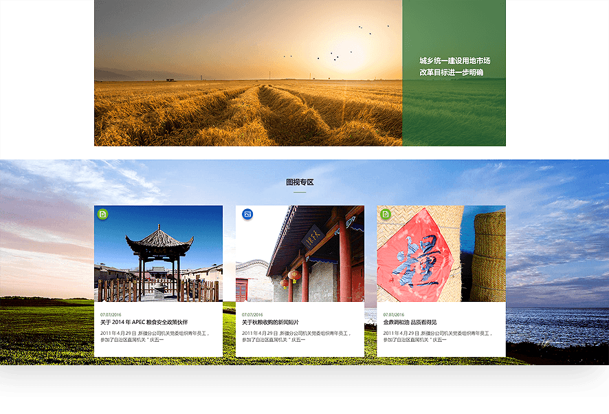 中儲糧官網(wǎng)采用扁平化ICON的方式,集中展示儲備管理、輪換購銷(xiāo)、專(zhuān)項調控等多元業(yè)務(wù),在保證用戶(hù)便于閱讀的基礎上,通過(guò)創(chuàng )意、交互吸引用戶(hù)關(guān)注。