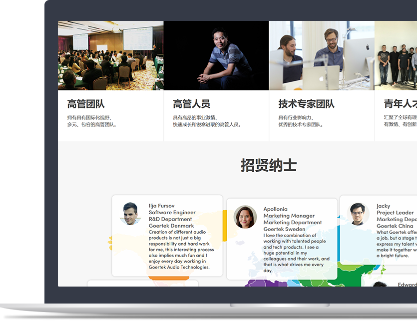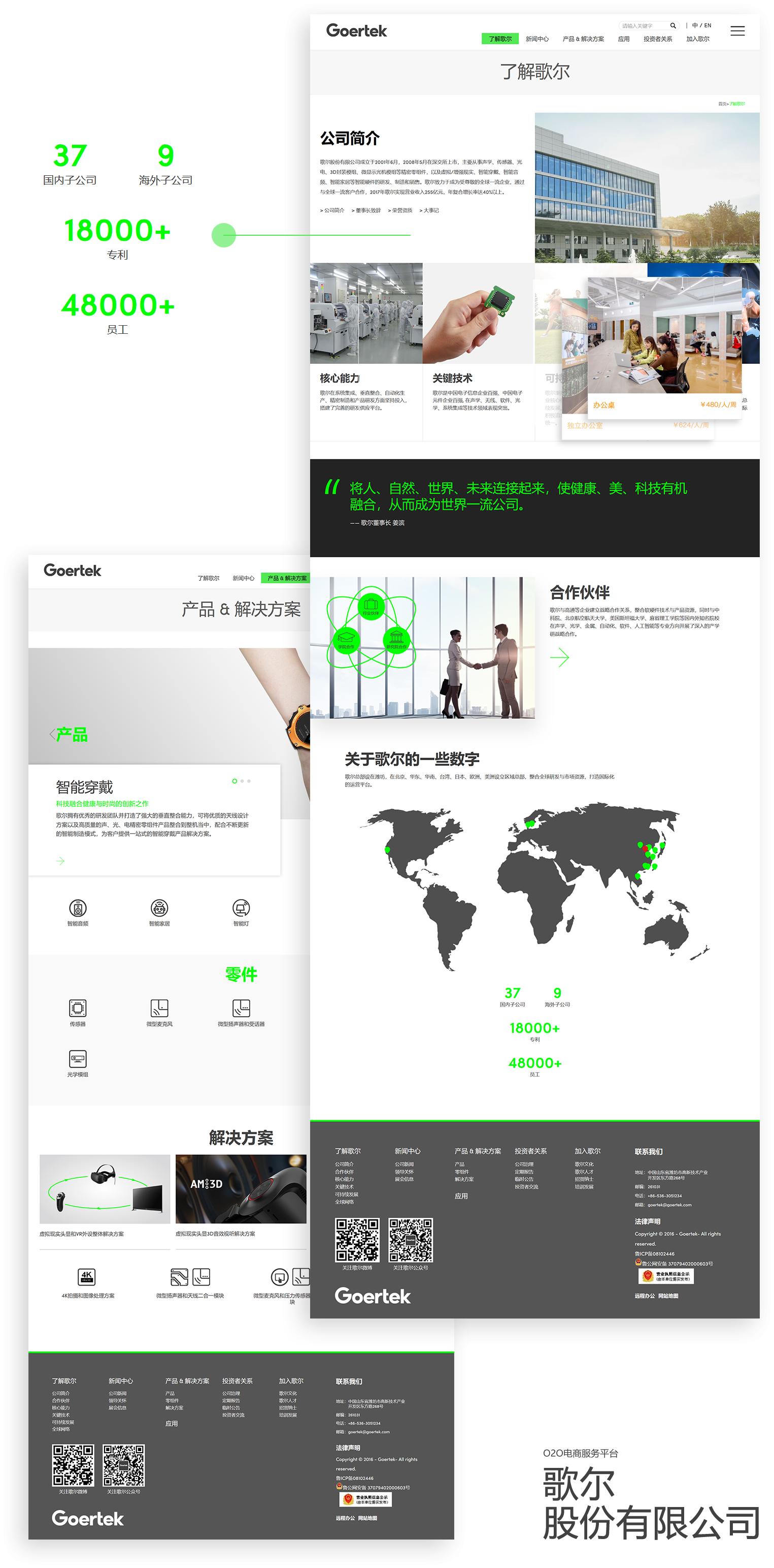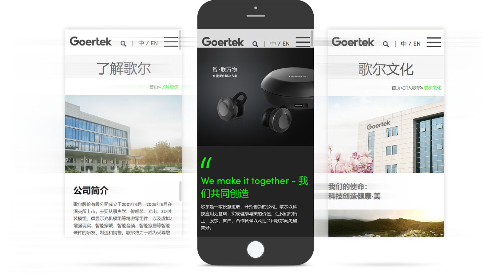 歌爾研發(fā)布局全球,在美國、日本、韓國、丹麥、北京、青島、深圳、上海、南京、臺灣等地分別設立了研發(fā)中心,以聲光電為主要技術(shù)方向,通過(guò)集成跨領(lǐng)域技術(shù)提供系統化整體解決方案。 我們一起創(chuàng )造 We make it together