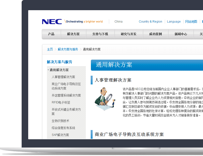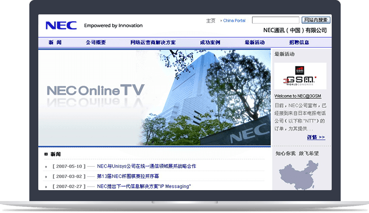 新鴻儒為NEC及旗下子公司建立中文網(wǎng)站群,實(shí)現后臺統一管理,同時(shí)規范網(wǎng)站群WEB視覺(jué)識別體 系,打造NEC電子、NEC通訊、NEC移動(dòng)的網(wǎng)絡(luò )視覺(jué)識別系統。