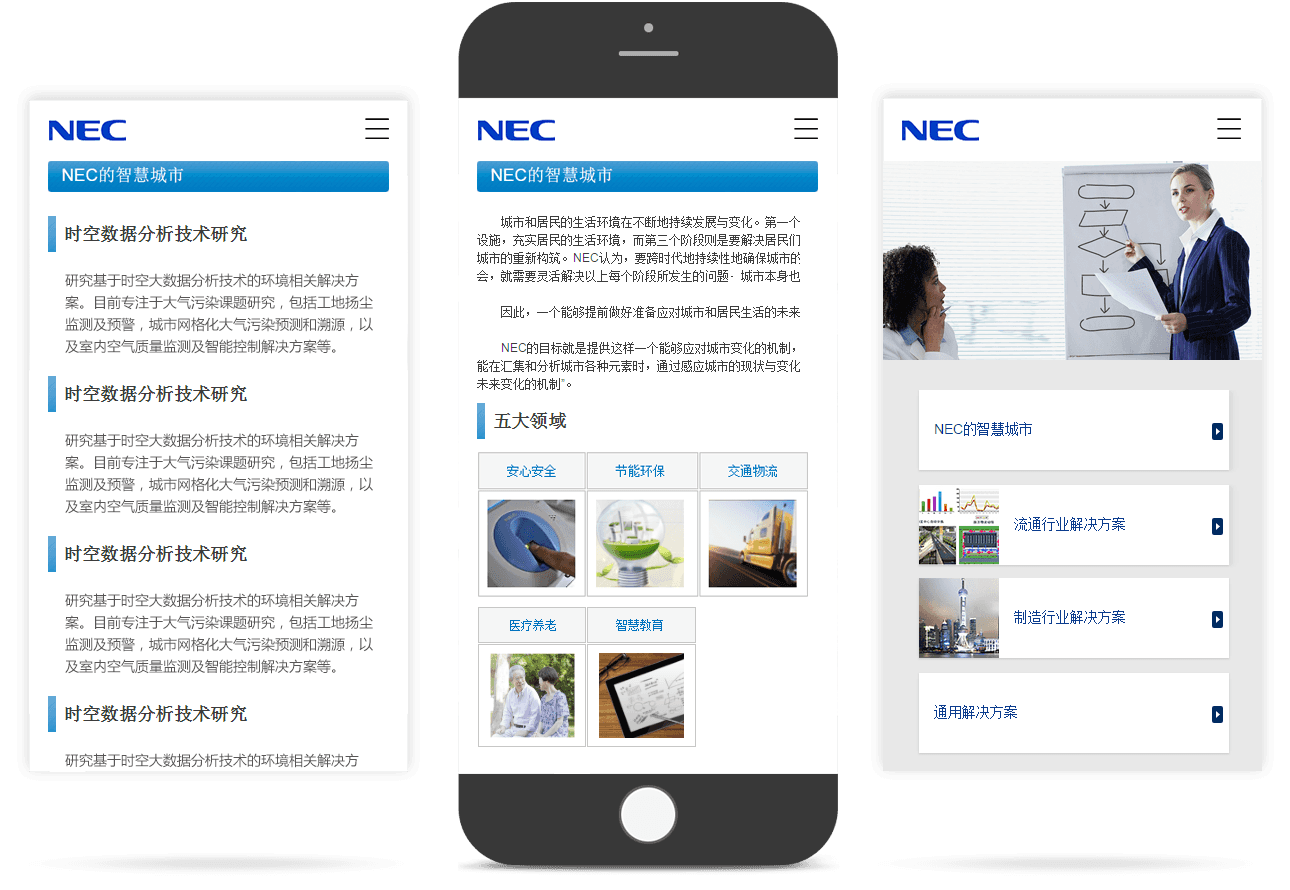 NEC網(wǎng)站以用戶(hù)需求為核心,經(jīng)過(guò)系列精準調研和產(chǎn)品 原型設計,最終合理規劃各功能板塊,在展示信息的同時(shí)有效引 導訪(fǎng)問(wèn)者咨詢(xún)相關(guān)服務(wù),輔助業(yè)務(wù)發(fā)展。