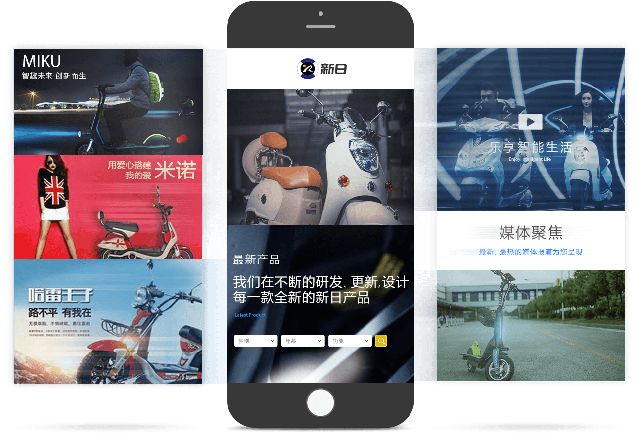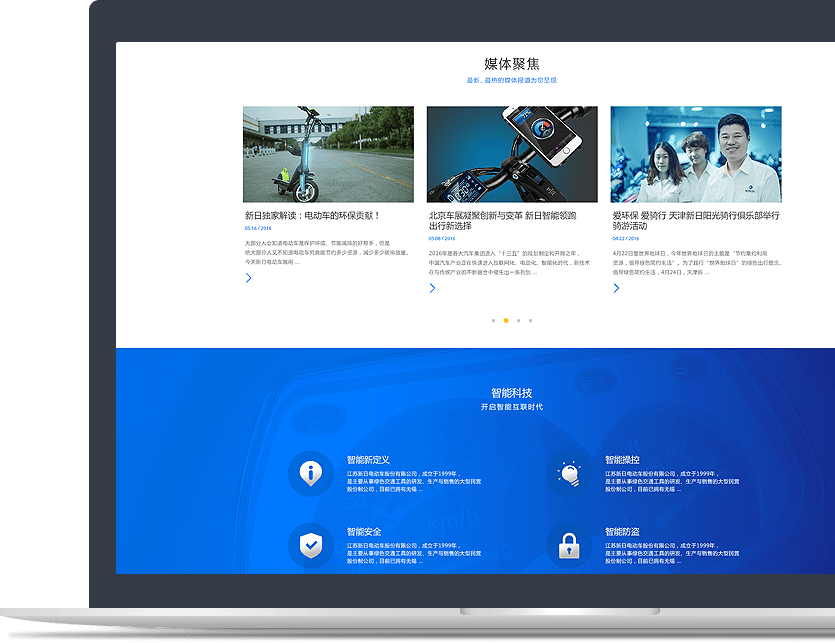 新日電動(dòng)車(chē)官網(wǎng)以品牌為核心,以產(chǎn)品為基礎,通過(guò)JS/CSS3交互技術(shù)、全屏視頻等方式, 塑造企業(yè)創(chuàng )新、智能的品牌形象。