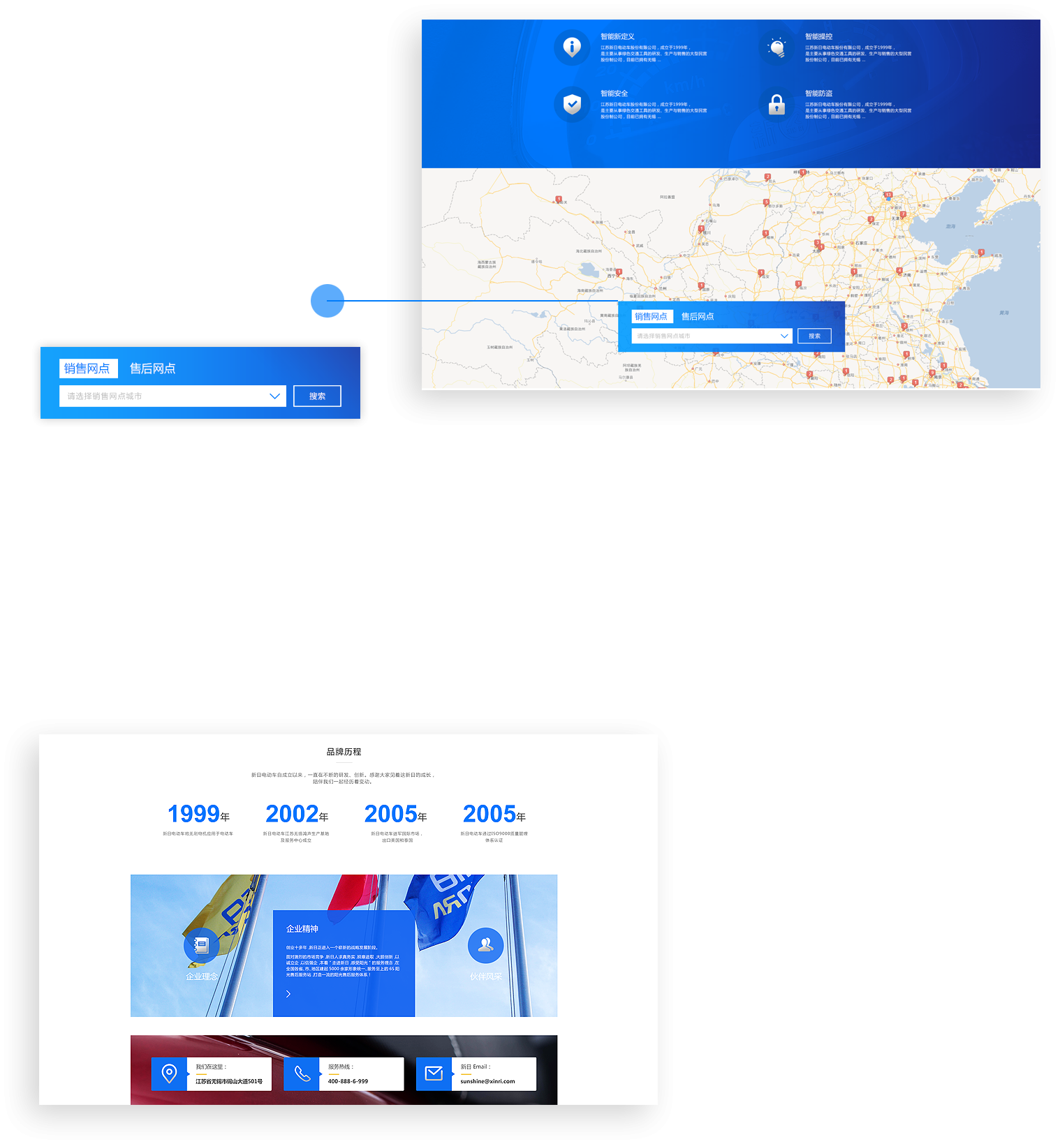 新日電動(dòng)車(chē)官網(wǎng)調取百度地圖實(shí)時(shí)數據,通過(guò)標簽定位的方式,實(shí)現銷(xiāo)售網(wǎng)點(diǎn)、售后網(wǎng)點(diǎn)的查詢(xún),極大的方便了用戶(hù),提升了服務(wù)質(zhì)量和銷(xiāo)售渠道。