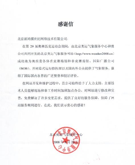 北京奧運氣象服務(wù)中心在此次項目中看到了新鴻儒的實(shí)力和努力! 并對北京奧運會(huì )氣象服務(wù)網(wǎng)站高度滿(mǎn)意,特此發(fā)來(lái)表?yè)P信,以示鼓勵和贊揚!