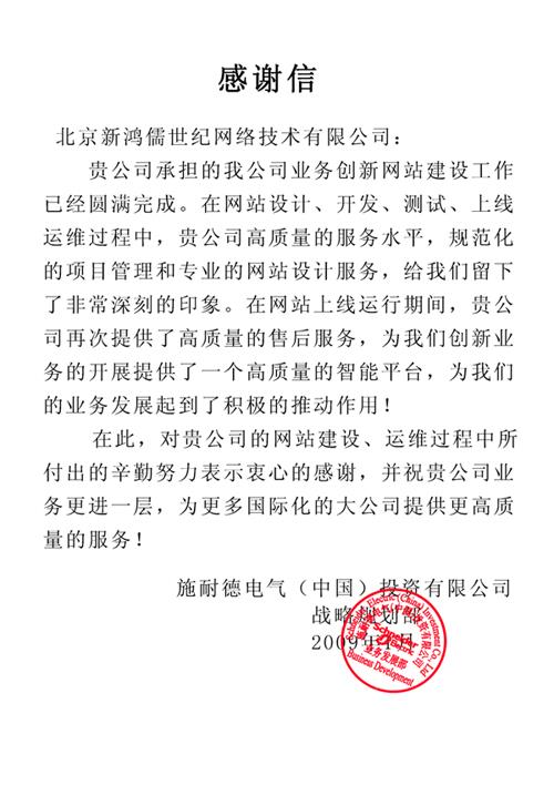 2009年1月施耐德電氣特此發(fā)來(lái)了表?yè)P信,這是對我們工作的認可,也是對我們日后前行發(fā)展的鼓勵,簡(jiǎn)簡(jiǎn)單單的幾句評價(jià)就為新鴻儒的前行增添了力量。新鴻儒堅信不會(huì )辜負客戶(hù)的希望,會(huì )在不斷改善自己的同時(shí),飛得更高做得更好來(lái)回饋給你們。