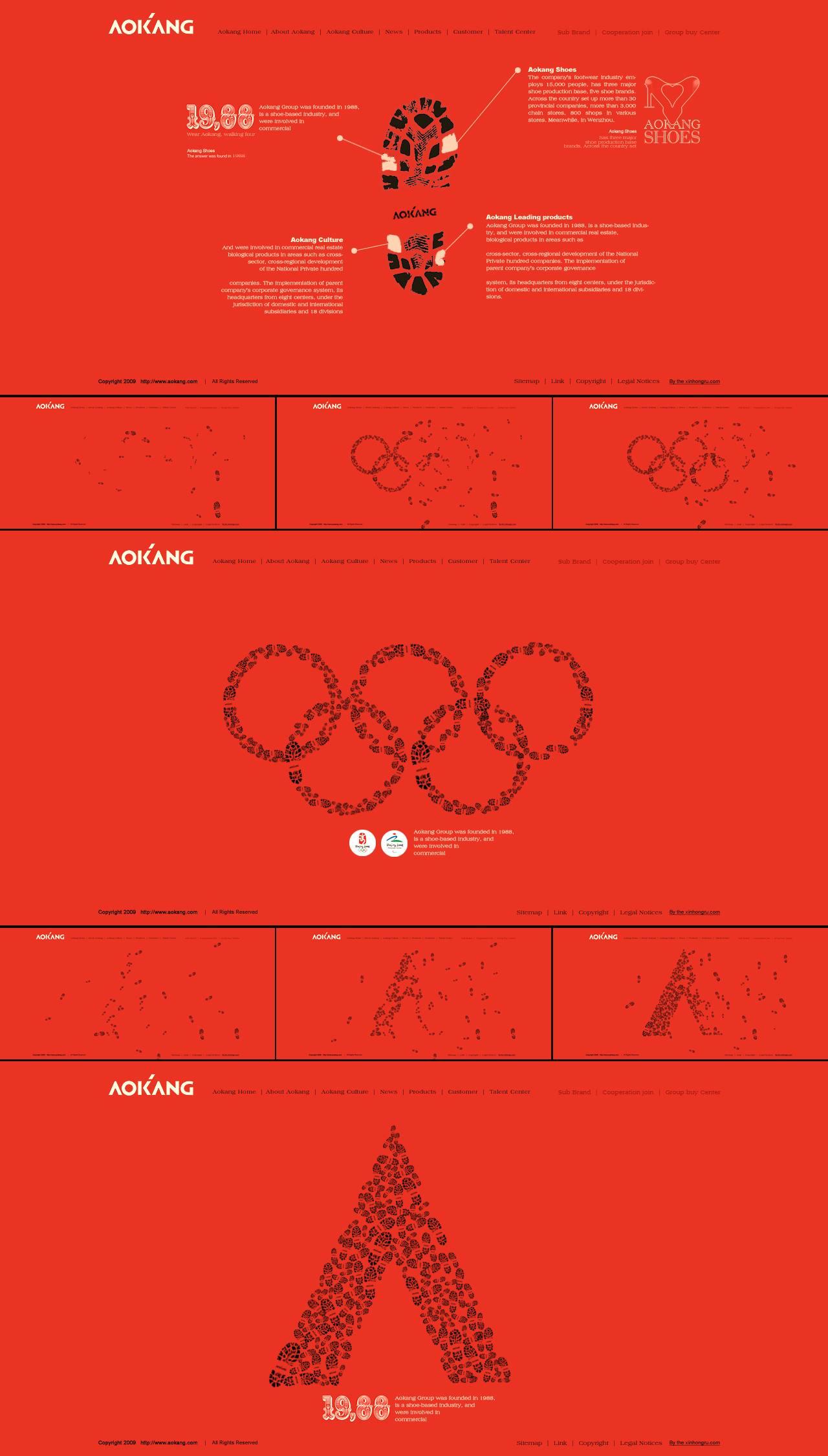 如圖所示,新鴻儒根據奧康集團所在行業(yè)優(yōu)勢,將企業(yè)發(fā)展核心配合鞋印動(dòng)態(tài)展示,生動(dòng)直觀(guān);又結合奧康集團作為2008年奧運贊助商這一特征,以鞋印組成奧運五環(huán),放大其奧運精神;最終,鞋印組合為奧康集團標志性logo,升華企業(yè)文化。