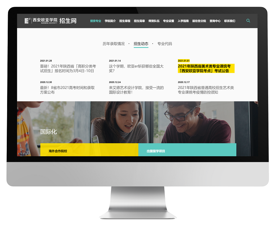 本次項目主要目的是通過(guò)對招生網(wǎng)站的升級,面對互聯(lián)網(wǎng)環(huán)境下成長(cháng)的全新一代準大學(xué)生進(jìn)行品牌宣傳,提升西安歐亞學(xué)院品牌形象、擴大品牌聲量、最終提升招生工作。新鴻儒服務(wù)西安歐亞學(xué)院已有11年,為數字化校園系統提供迭代更新、系統升級、各平臺系統的融合擴展工作,得到了院方各領(lǐng)導的高度認可與支持。
