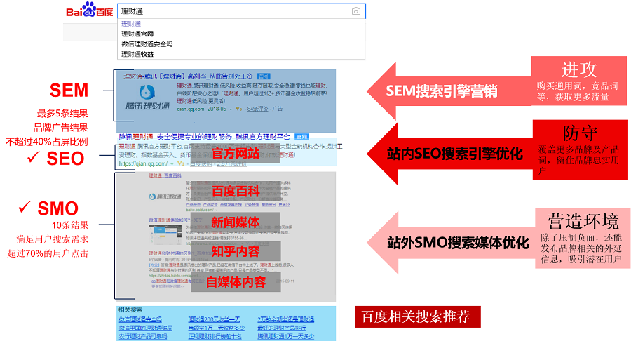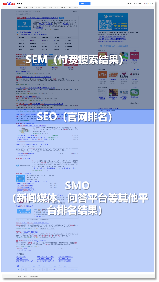 通常情況下用戶(hù)在搜索引擎中查詢(xún)企業(yè)時(shí),SEM、SEO、SMO的信息呈現順序如下圖: